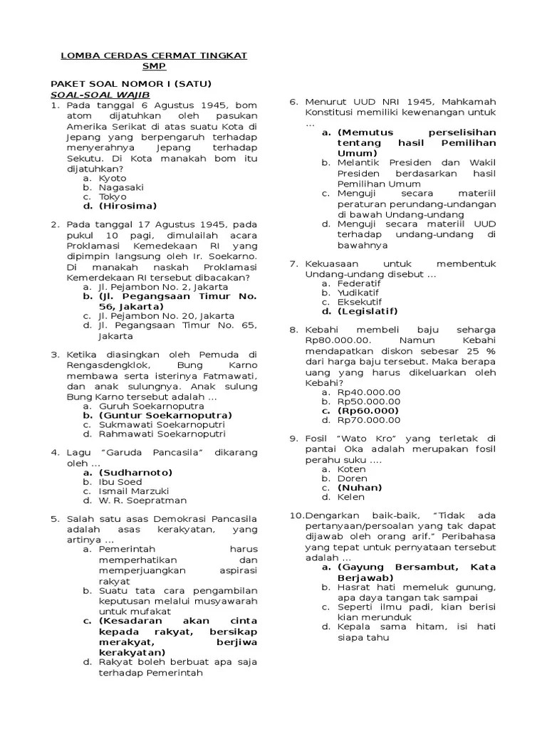 soal dan kunci jawaban lomba cerdas cermat lcc tingkat sd pilihan ganda. Jika jawaban salah, maka nilai akandikurangi setengah dari poin soal.nilai dari sesi pertanyaan wajib, lemparan dan rebutan akan diakumulasikan untuk menentukanjuara i, ii, dan iii.7) peserta dilarang menggunakan alat bantu seperti kalkulator, handphone dan alatbantu lainnya.8) pemenang dari lomba cerdas cermat adalah kelompok dengan score. Academiaedu is a platform for academics to share research papers. soal cerdas cermat jumat 29 agustus 2014. soal cerdas cermat smp panitia hari ulang tahun kemerdekaan ri ke 69.